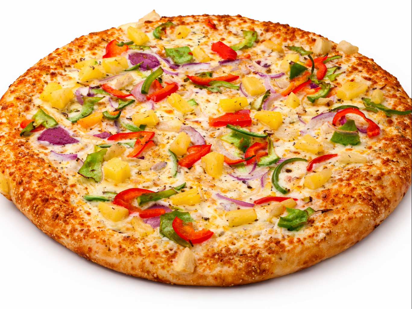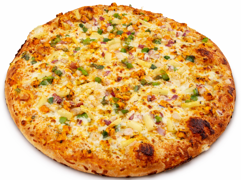 Juicy pineapple chunks on rich masala sauce, topped with mozzarella, onions, and bell peppers, baked to perfection.