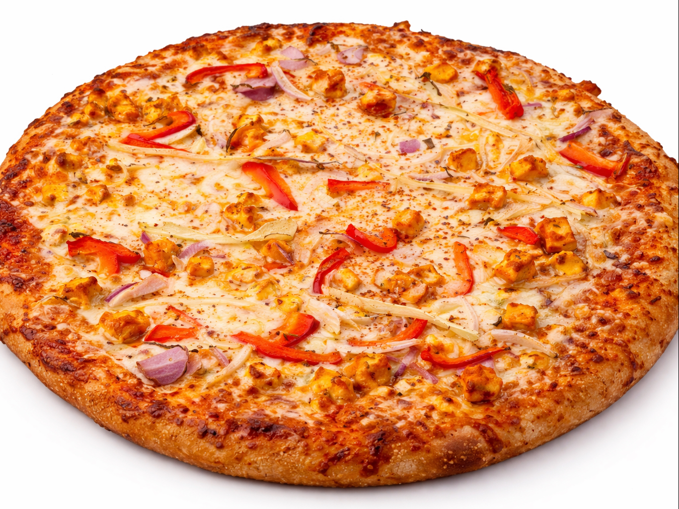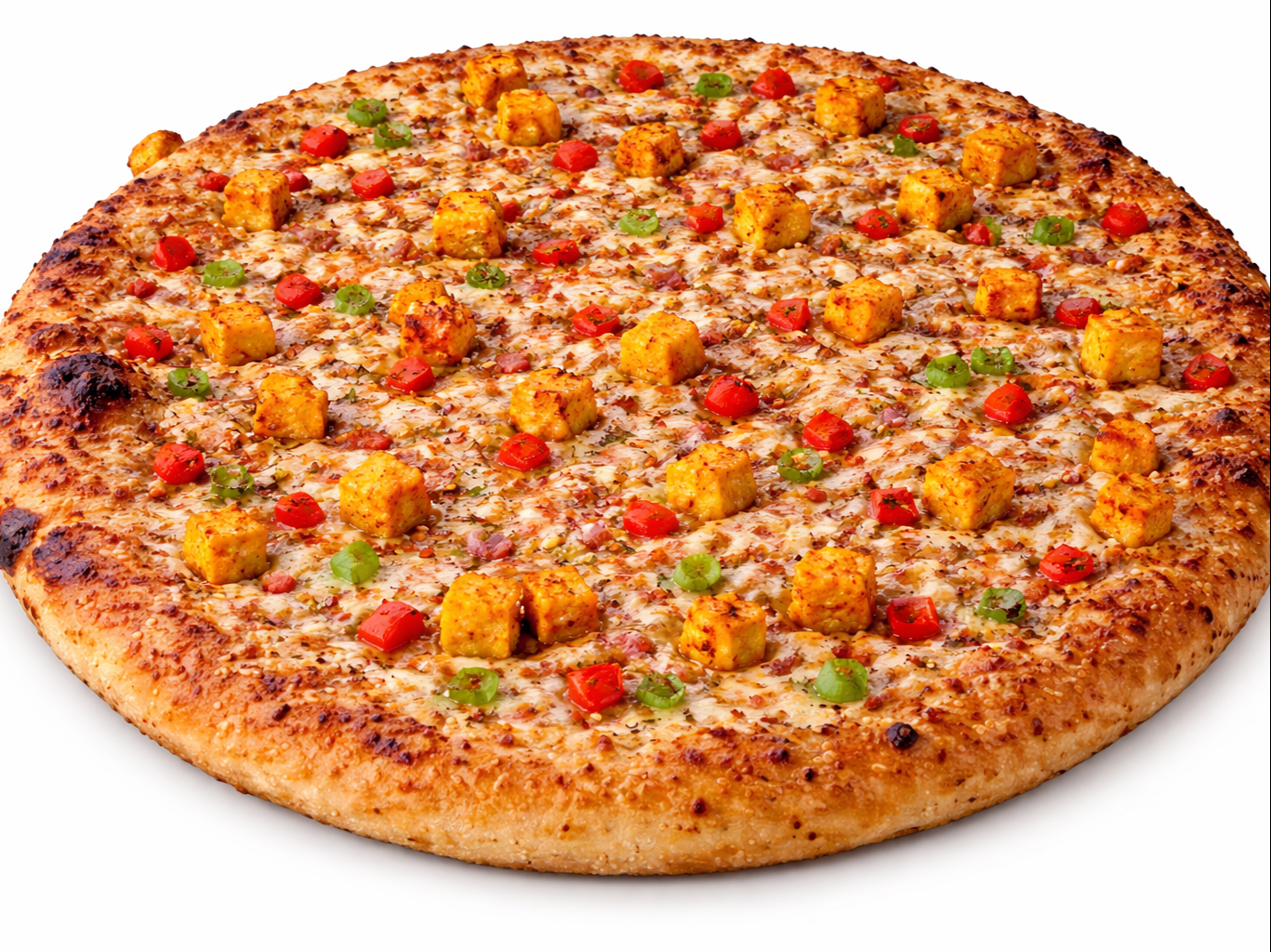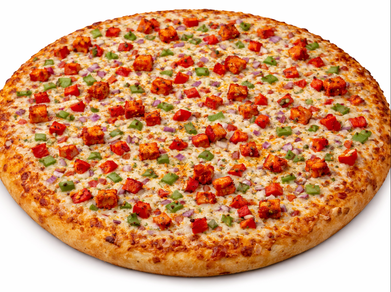 Marinated paneer in rich tikka masala sauce, topped with mozzarella, onions, and bell peppers, baked to perfection.