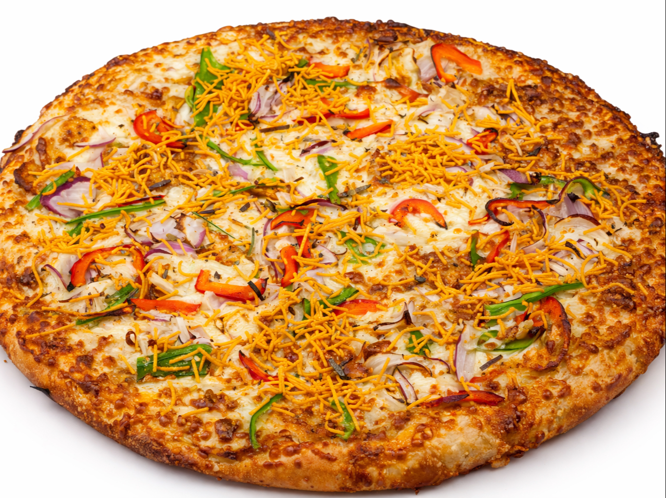 Masala sauce topped with mozzarella, onions, black olives, bell peppers, corn, mushrooms, tomatoes, and thin strips of fresh ginger, baked to perfection.