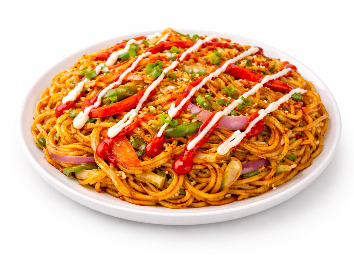 Stir-fried noodles with onions and bell peppers, and cabbage, tossed in a flavorful soy-ginger chili sauce — light, spicy, and full of bold taste.