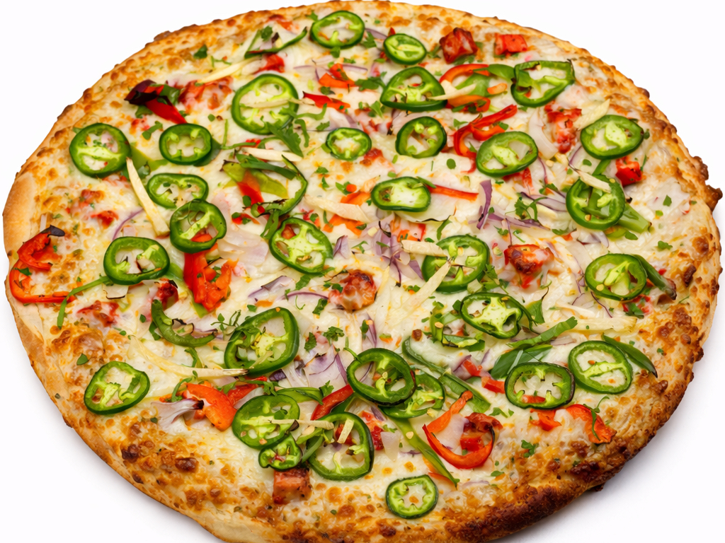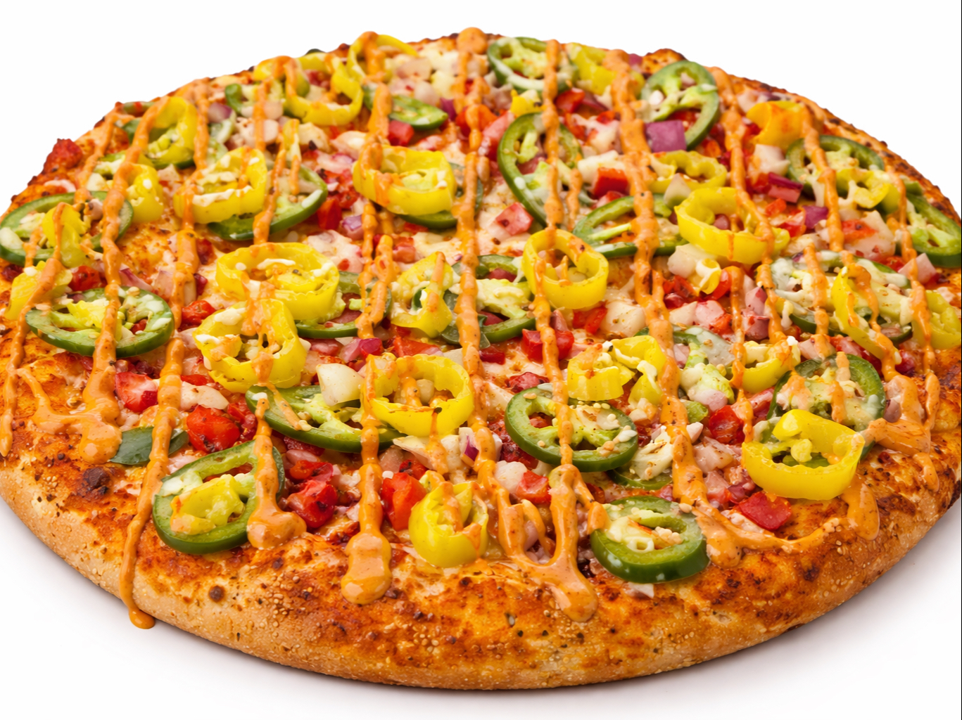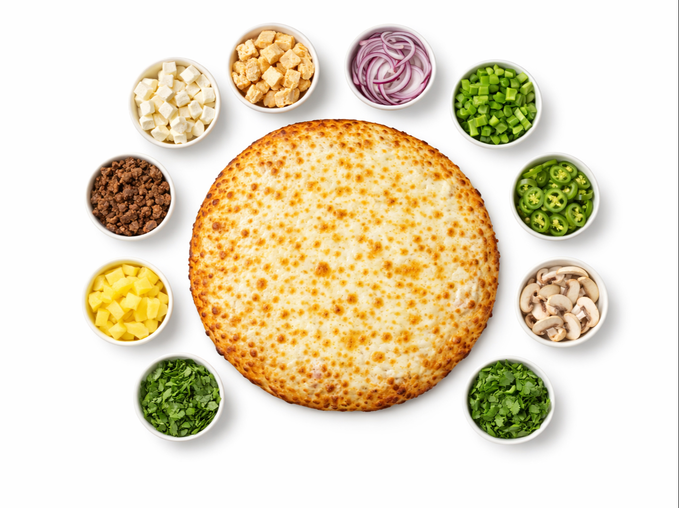 Marinated Paneer in our in-house special sauce, topped with mozzarella, onions, jalapeños, banana & bell peppers — finished with a bold chipotle ranch drizzle after the bake.