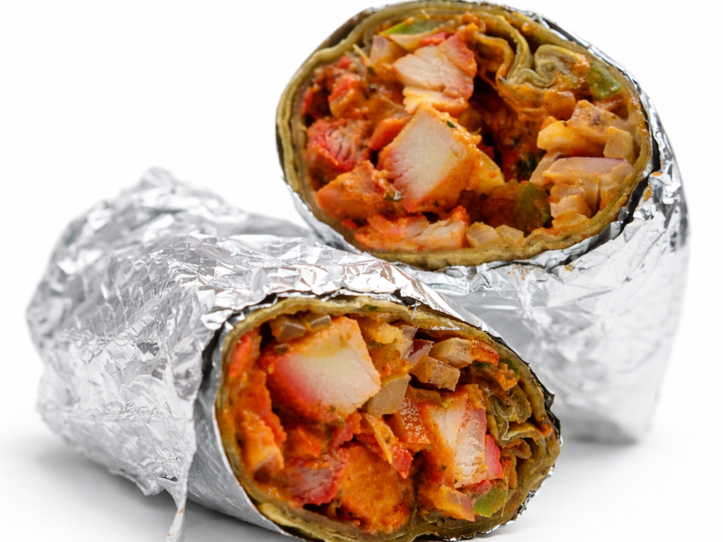 Marinated chicken wrapped in a soft spinach tortilla, smothered in creamy tomato-based butter masala, layered with onions, bell peppers, chipotle sauce, and a touch of mayo. Served with your choice of side sauce.